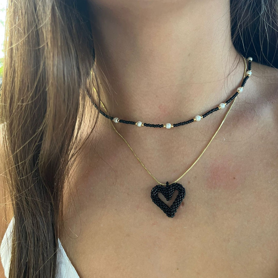 - The Miyuki Black Heart Triple Necklace is a refined expression of modern elegance. Featuring a delicate gold chain adorned with a bold handwoven black heart pendant, it pairs effortlessly with a beaded choker accented by luminous pearls