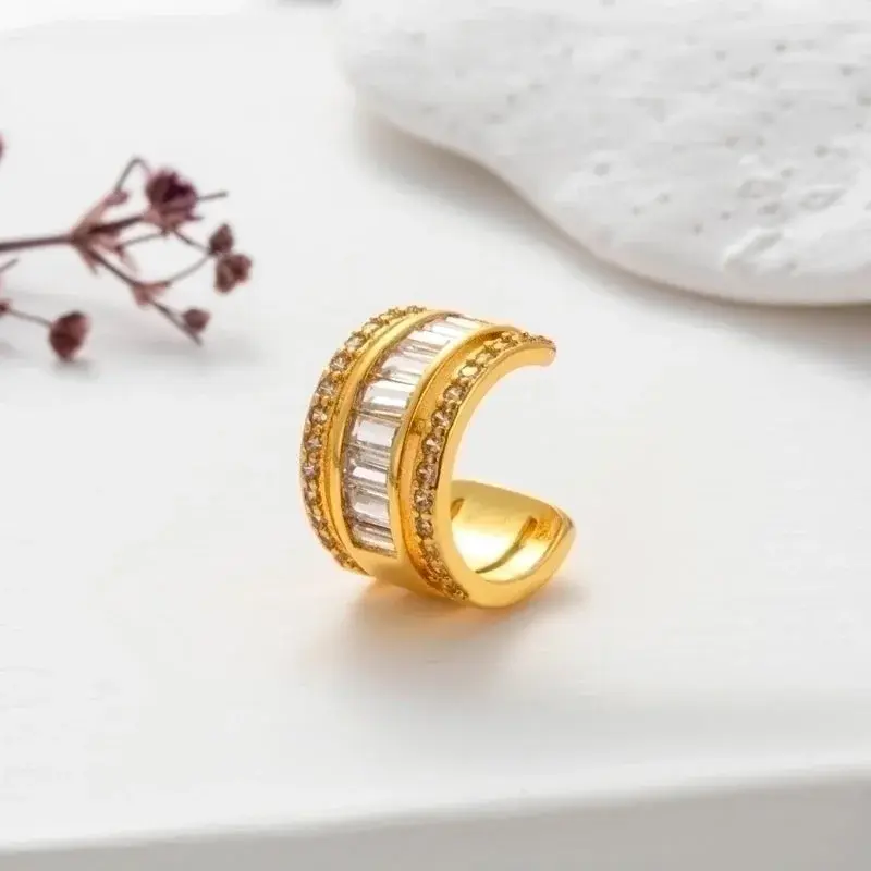 Bold yet refined, this 18k gold-plated ear cuff dazzles with a row of baguette-cut crystals framed by delicate pavé accents. A statement of modern luxury, designed to elevate any look with effortless sparkle.