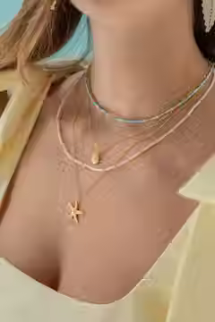 The Ocean Star Dream Necklace captures coastal elegance in a luminous design. A delicate gold chain holds a polished sea star pendant, its smooth finish reflecting light with effortless sophistication. Inspired by the beauty of the ocean, this piece evokes both serenity and strength—perfect for elevating everyday style or complementing beach wear. This piece is accompanied by three complementary necklaces: a sleek gold chain, a handcrafted beaded strand in luminous white, and a second beaded creation in serene blue. Worn together, the quartet creates a layered look that is both modern and refined, perfect for elevating any ensemble from day to night.